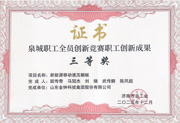 金鐘科技集團(tuán)以“新能源移動(dòng)液壓翻板”項(xiàng)目獲評(píng)三等獎(jiǎng),項(xiàng)目聚焦散料卸車領(lǐng)域長(zhǎng)期存在的施工成本高、位置固定、轉(zhuǎn)運(yùn)不便等問題,通過創(chuàng)新設(shè)計(jì)成功實(shí)現(xiàn)“可移動(dòng)、免基礎(chǔ)、新能源”三大突破,為行業(yè)提供了高效、靈活、綠色的全新解決方案,展現(xiàn)了企業(yè)響應(yīng)節(jié)能減排、裝備智能升級(jí)的積極成效。